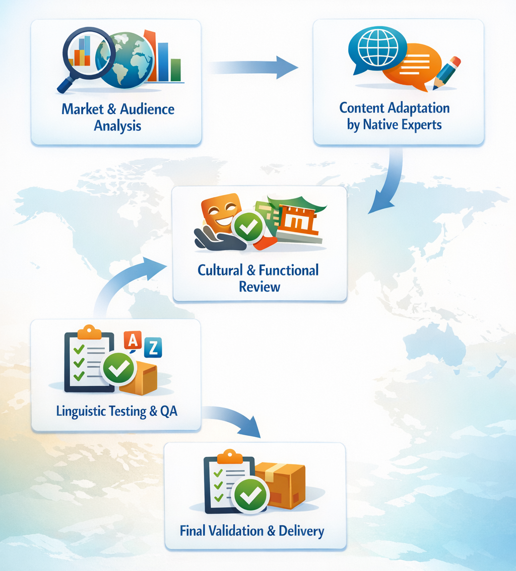 Native linguists adapt content for natural, accurate communication.